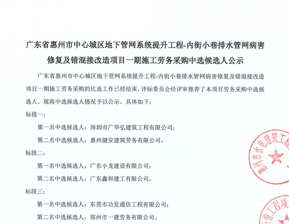 廣東省惠州市中心城區(qū)地下管網(wǎng)系統(tǒng)提升工程-內(nèi)街小巷排水管網(wǎng)病害修復(fù)及錯混接改造項(xiàng)目一期施工勞務(wù)采購(第二次)中選候選人公示……